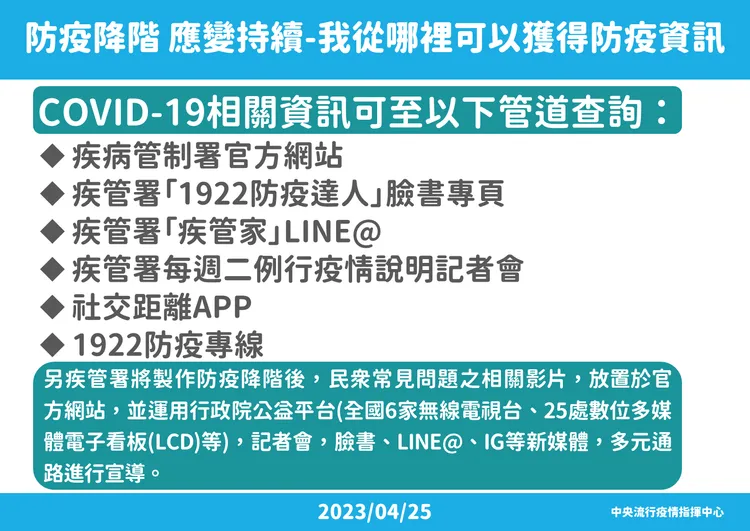 5月1日後衛福部防疫團隊和專家小組並未解散,持續整備應變,密切監視疫情變化,如住院和重症率增加,或出現高威脅變異株,顯示疫情風險提高,將即時啟動跨單位應變。