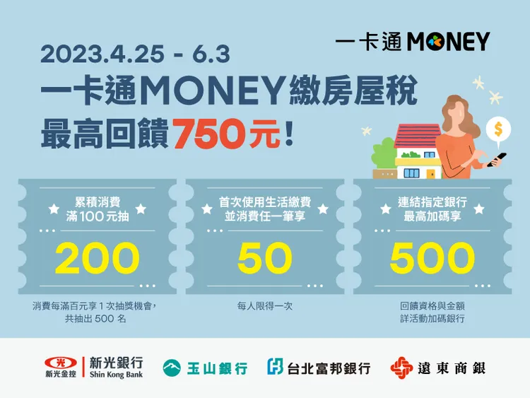 5/1起開徵的2023年「房屋稅」,於4/25至6/3使用iPASS MONEY帳戶繳「房屋稅」,與「使用牌照稅」享相同抽獎機會,一般消費累積金額每滿100元,有1次抽獎機會,有機會抽中iPASS MONEY儲值金200元。
