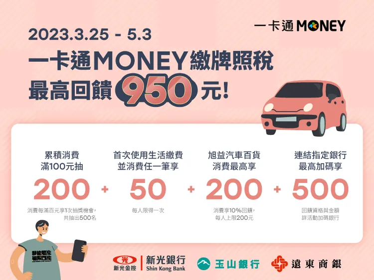 一卡通公司表示,於5/3前使用iPASS MONEY帳戶繳納任一筆2023年「使用牌照稅」,一般消費累積金額每滿100元,有1次抽獎機會,可抽iPASS MONEY儲值金200元,活動期間於旭益汽車百貨實體門市消費還享可iPASS MONEY儲值金10%回饋,累計最高可回饋950元。