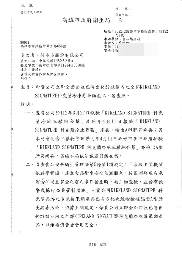 高市衛生局指,根據衛福部食藥署於邊境查驗、及高市衛生局於後市場抽驗好市多股份有限公司輸入之產品,已有多件檢出A型肝炎病毒陽性,因好市多商業登記所在地在高雄市,高市衛生局今(5日)發出公函,命好市多股份有限公司,基於企業責任,立即全面回收已售出、仍於效期內的全部KIRKLAND SIGNATURE科克蘭冷凍莓果類產品,以維護消費者食用安全。