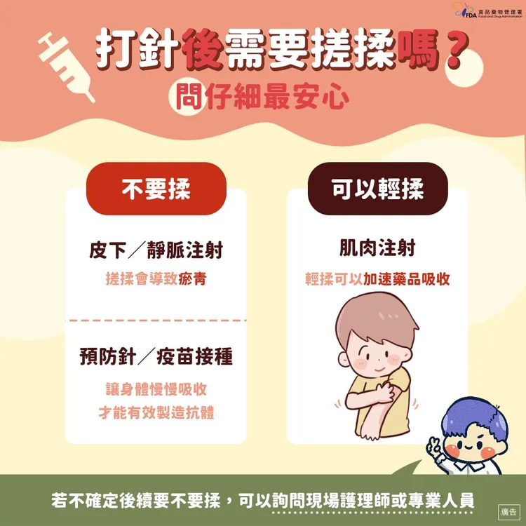 而食藥署也提醒,若接受皮下注射、靜脈注射後去揉,可能會使血管遭到拉扯,反而導致皮下出血或瘀青。