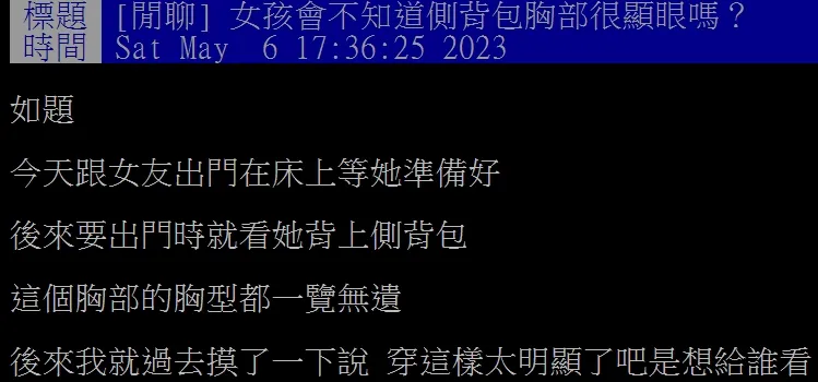 男網友在論壇PTT發文問說「女孩會不知道側背包胸部很顯眼嗎?」他表示,前幾天他跟女友要出門,坐在床上等她準備好,後來要出門時就看她揹上側背包,整個胸部的胸型都一覽無遺,「後來我就過去摸了一下說,穿這樣太明顯了吧,是想給誰看?」