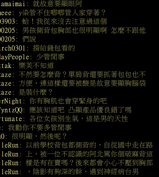 鄉民留言表示,「側背很容易掉呀」、「路上到處是側背包包的女性,而且側背肩膀負擔比較小,你在意的話就幫女友背」、「故意的不行嗎」、「女生更在意體感之類的」、「哪只有你注意這個,我也有注意」、「啊?不會有人特別去看這個啊?」、「就故意要顯眼啊」、「應該知道吧,凸顯產品優良錯了嗎」、「我勸你不要多管閒事」、「就是有這種愛亂看的人害人駝背、肩頸痠痛」。