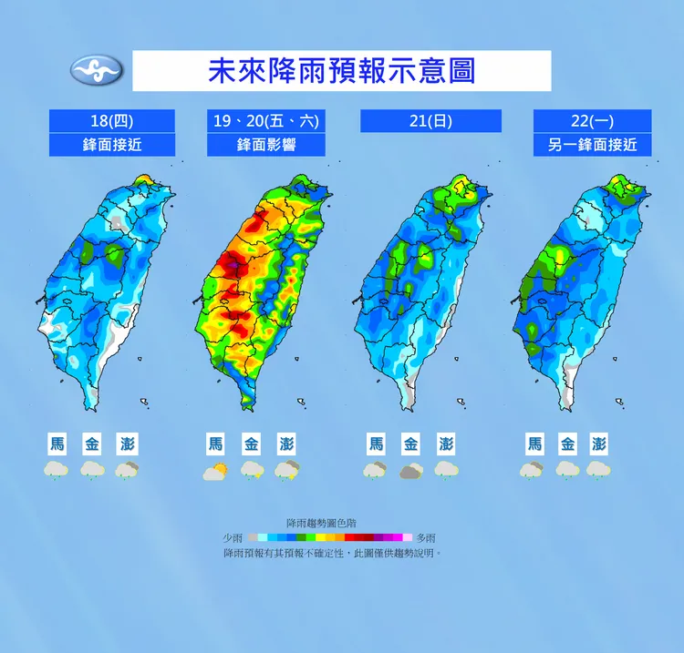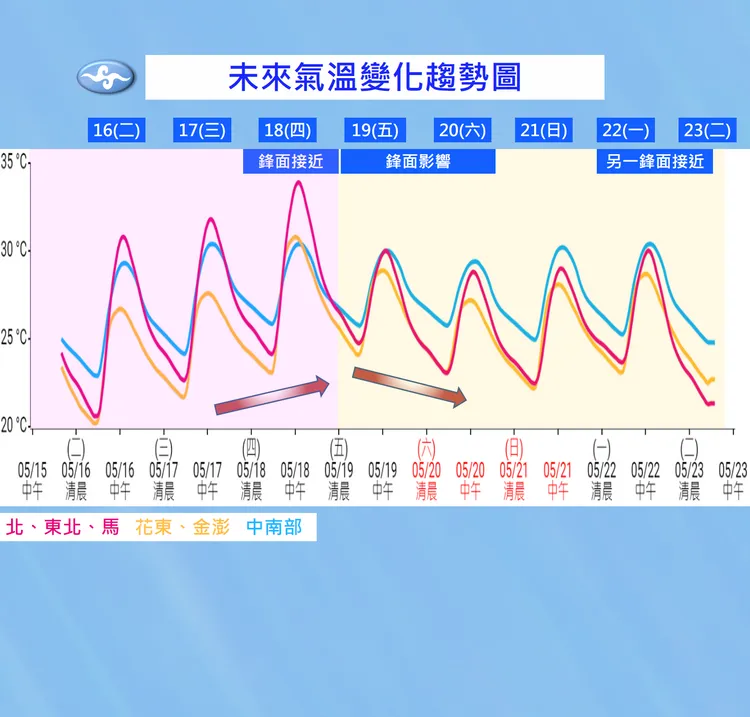到下周一(5/22),有另一鋒面接近,西半部地區有局部短暫陣雨,其他地區亦有零星短暫陣雨。下周二(5/23)鋒面影響,各地有短暫陣雨,且周五後各地白天高溫略低於30°C,各地一日最低溫則變化不大,仍有約22-24°C。