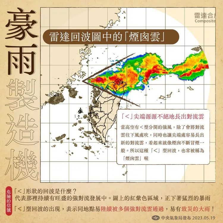 氣象局說明「煙囪雲」出現原因,在春夏季,當強對流誕生後,若高空有 「水平」、「<型分流」的強風,就會把原本的對流雲吹遠、 並讓出空間給新的對流雲生成,因此強對流雲會不停從同樣的位置(即<型尖端處)長出、並被吹向風的下游,就彷彿煙囪不停地冒出雲一般,而被煙囪雲覆蓋的地區, 會持續、重複地被強對流雲路過, 就會在幾個小時內不停地降下豪大雨!