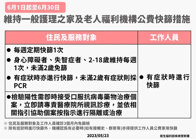 疾管署另說明,同時考量近期機構住民篩檢陽性率於1.4%-1.6%間,且住宿式機構照顧較多慢性病及重症高風險族群的長者,應維持警惕避免發生機構群聚感染風險,故延長一般護理之家及老人福利機構定期執行COVID-19公費快篩之措施:服務對象仍維持快篩頻率為每週一次,至今年6月30日止。