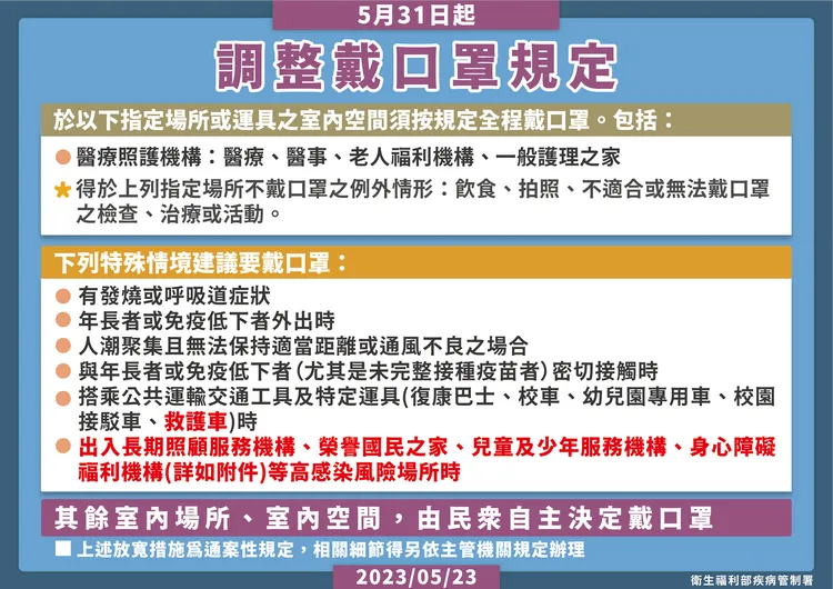 二、特殊情境建議要戴口罩,除維持原列情境:有發燒或呼吸道症狀、年長者或免疫低下者外出時、人潮聚集且無法保持適當距離或通風不良之場合、與年長者或免疫低下者(尤其是未完整接種疫苗者)密切接觸時、搭乘公共運輸交通工具及特定運具(復康巴士、校車、幼兒園專用車、校園接駁車)時以外;調整「搭乘救護車時」及「出入長期照顧服務機構、榮譽國民之家、兒童及少年服務機構、身心障礙福利機構等高感染風險場所時」亦為建議戴口罩。