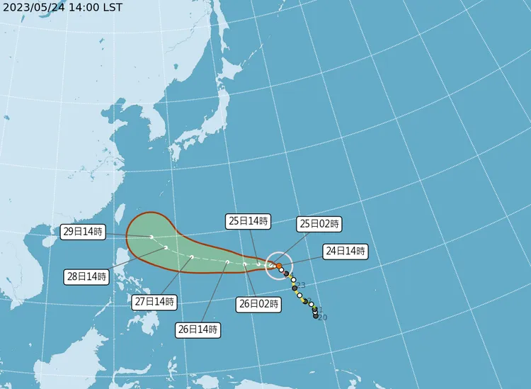劉沛滕提到,瑪娃於下周一、下周二(5/29、5/30)接近台灣,不過減速北轉後,還不確定實際上會多接近,但屆時也將影響東半部、基隆北海岸降雨,仍須持續觀察。