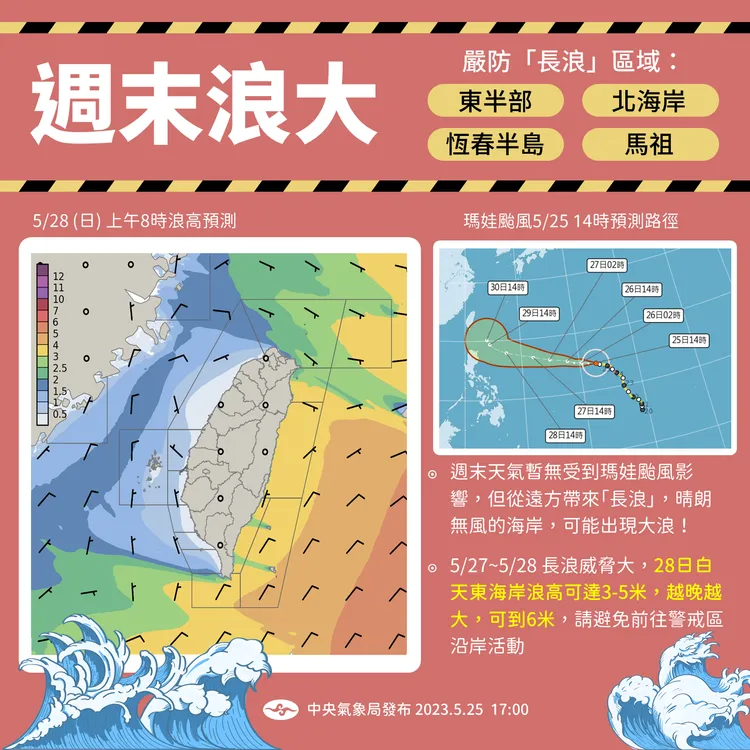 強烈颱風瑪娃今日(5/25)下午14時的中心位置在鵝鑾鼻東南東方2490公里的海面上,以每小時24公里速度,向西進行。中心氣壓910百帕,近中心最大風速每秒55公尺,瞬間最大陣風每秒 68 公尺,七級風暴風半徑 250 公里,十級風暴風半徑 80 公里。