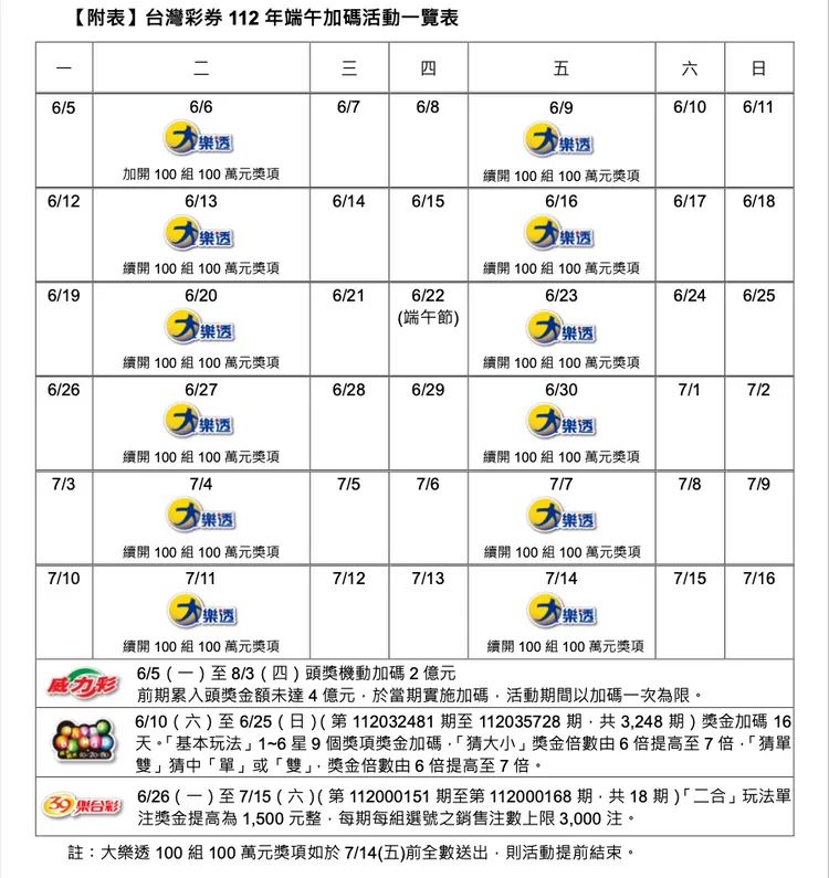 此外,容易累積鉅額頭獎的「威力彩」,謝志宏則指出,6月5日至8月3日頭獎採機動加碼,若前期累入頭獎金額未達4億元,當期獎將加碼2億元,活動期間以加碼1次為限。