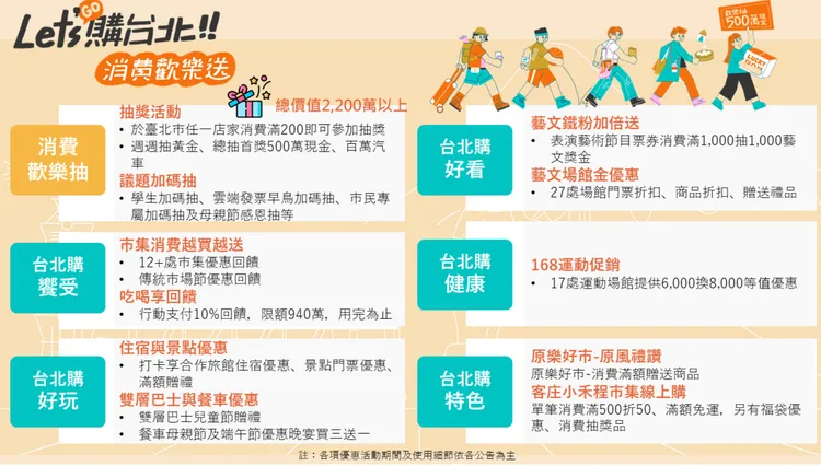 台北市政府商業處表示,「2023 Let's購台北 消費歡樂抽」活動將於5月31日截止,凡於2023年4月1日起,在台北市店家消費的發票、收據皆可登錄,消費每滿200元就有1次抽獎機會,單筆上限可有100次抽獎機會。