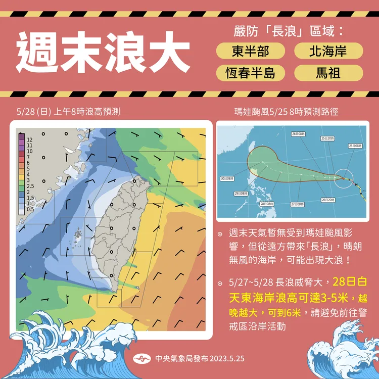 氣象局提醒,周末天氣暫無受到瑪娃颱風影響,但從遠方帶來「長浪」,晴朗無風的海岸可能出現大浪,周六、下周日(5/27、5/28)長浪威脅大,下週日白天東海岸浪高可達3~5米,越晚越大,可到6米,請避免前往警戒區沿岸活動。