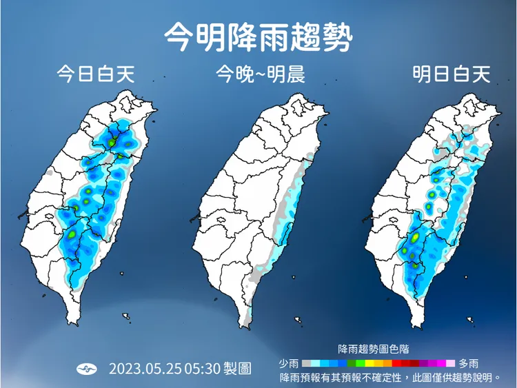 週六和下週日(5/27、5/28),各地仍為多雲到晴,午後山區有雷陣雨,尤其南部山區午後雷陣雨明顯較大、降雨時間較久,迎風面東半部地區不定時局部短暫陣雨。溫°C上都有31~33°C,東半部30°C。
