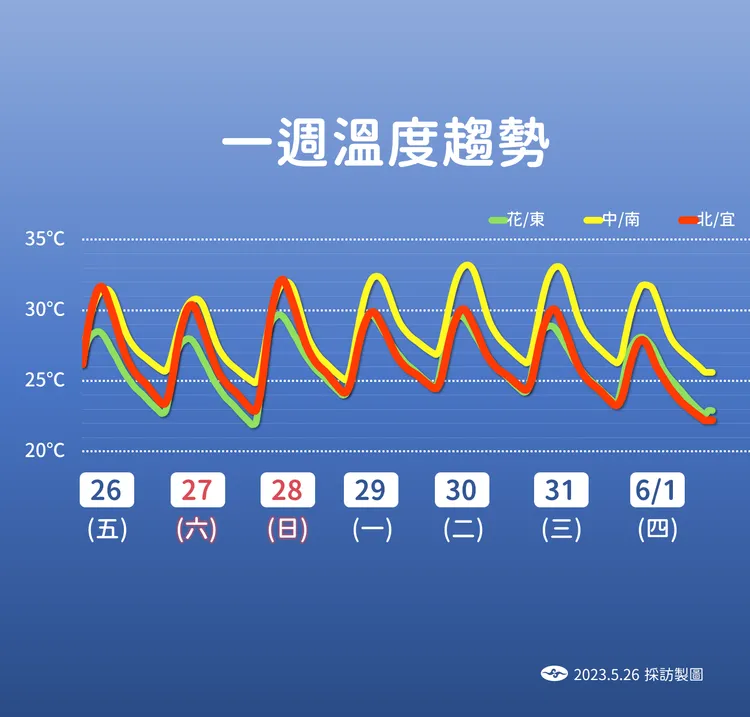 周日(5/28)雨區稍微擴大一些,葉致均說明,包含基隆北海岸、東半部和恆春半島可能有局部短暫陣雨,午後各地山區也有局部短暫雷陣雨,但是周日降雨情況還不會太明顯。