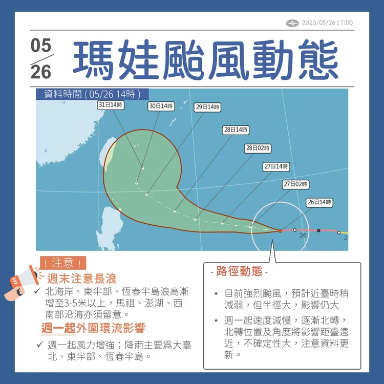 而強烈颱風瑪娃今日(5/26)下午14時的中心位置在關島西北西方780公里之海面上(鵝鑾鼻東南東方1950公里之海面上),以每小時26公里速度,向西北西進行。中心氣壓900百帕,近中心最大風速每秒58公尺,瞬間最大陣風每秒 73 公尺,七級風暴風半徑 300 公里,十級風暴風半徑 120 公里。