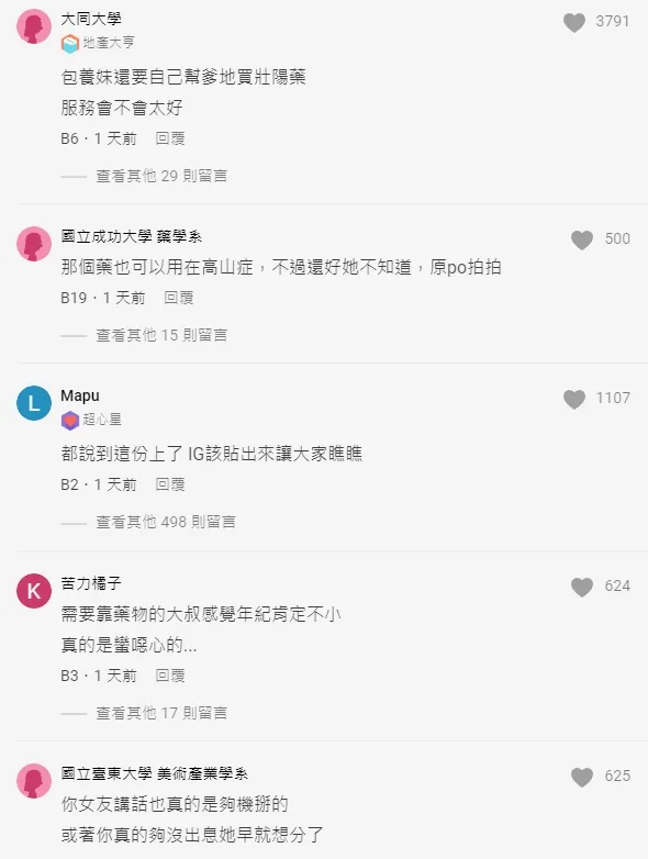 網友留言說,「包養妹還要自己幫爹地買壯陽藥,服務會不會太好」、「那個藥也可以用在高山症,不過還好她不知道,原po拍拍」、「IG網美也敢交,服了you」、「沒辦法,人家是有兩萬追蹤的網美,當然希望能夠物質上追求好一點的生活」、「我以為是意外發現女友的真實性別,好險不是,只是被綠了(?誤」。