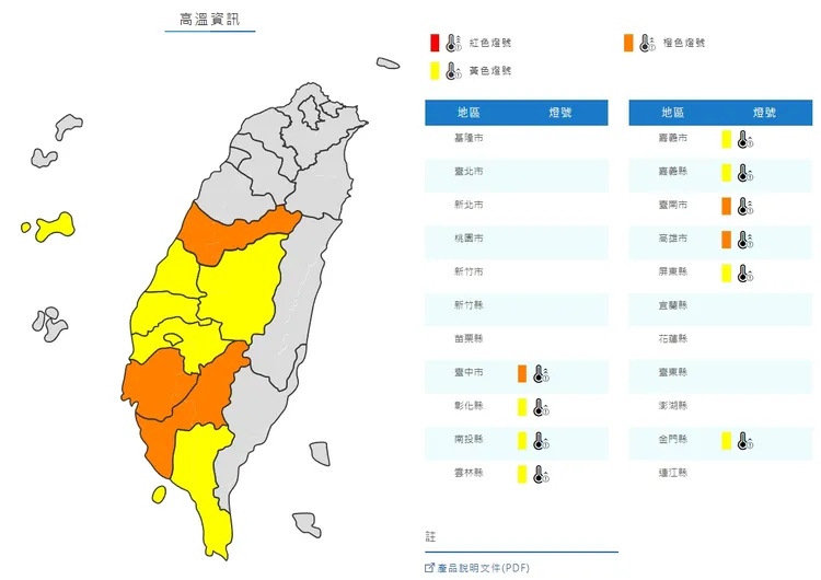 另外,颱風外圍環流沉降影響,氣象局今日針對西半部台中以南10縣市發布高溫資訊,台中市、台南市近山區或河谷為橙色燈號,有38˚C極端高溫出現的機率;高雄市近山區或河谷為橙色燈號,有連續出現36˚C高溫的機率,請加強注意。嘉義市、金門縣地區,彰化縣、南投縣、雲林縣、嘉義縣、屏東縣近山區或河谷為黃色燈號,請注意。