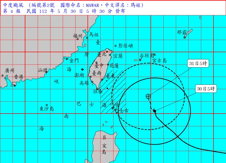 中央氣象局(30日2時)「颱風路徑潛勢預測圖」顯示,預測「瑪娃」逐漸進入巴士海峽,將轉偏北、平行東海岸前進,與台灣保持一定距離,由於是「大型中颱」,其暴風圈仍將先後通過東側各海域,警戒區亦將逐步調整,應注意中央氣象局最新資訊。