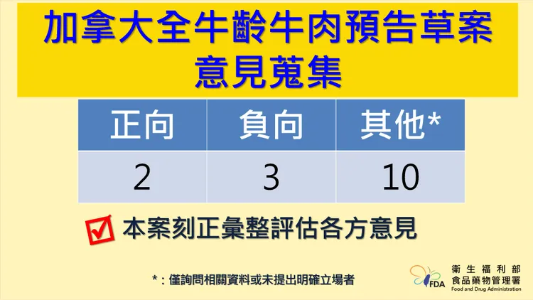 預告期間於5月29日到期,鄭維智說,申請期間經過專家風險評估為,為可接受風險,預告截止後收到15則意見,分別為2則正向意見、3則負向意見及10則其他意見,正向意見來自立委及其他民眾,負向意見則為公協會、消基會及1名民眾,食藥署在過程中也已提供諮詢會、查廠報告、風險評估報告等資訊。