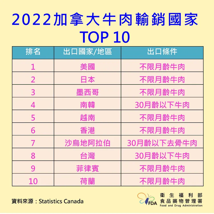 針對開放全齡加拿大牛肉進口,衛福部食藥署食品組副組長鄭維智說,2007年起,即開放30個月齡以下去骨牛肉,迄今有近16年的食用歷史,後陸續於2014年開放30個月齡以下帶骨牛肉,加拿大並於2021申請全齡牛肉開放,食藥署在今(2023)年4月27日預告開放全牛齡牛肉進口。