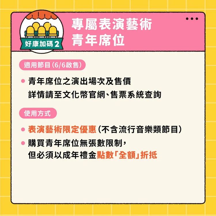 可用於獨立書店,消費2點回饋1點,最高可放大至1800點;購買表演藝術門票,可享5折或5折以下專屬「青年席位」優惠;後續將再公布「青春限定獨享優惠」。