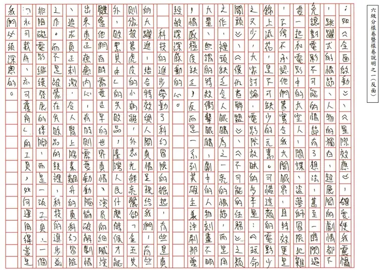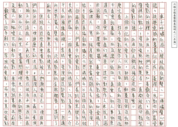 根據教育部公布的寫作6級分樣卷,除了能依據寫作任務、統整圖表資訊,其中一名考生從「動作冒險」類型電影的驚心動魄畫面切入,通過九零年代寫實電影的紀實拍攝手法與現今觀眾大多偏好講究特效、聲光效果的「動作冒險」類型形成對比,從而對盲目追求炫目特效電影製作提出批判。文章結構完整,脈絡分明,內容前後連貫。