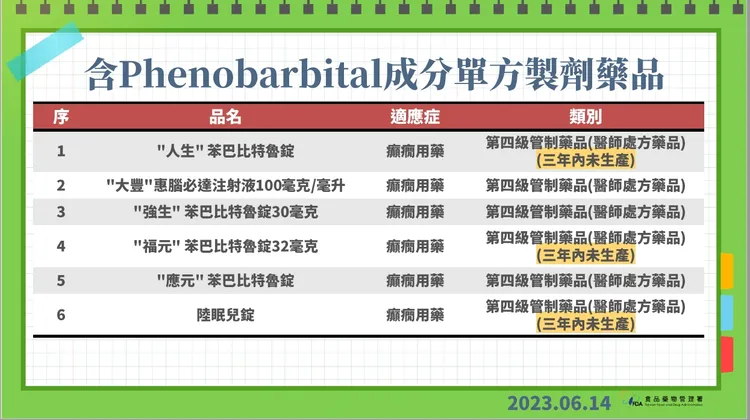 食藥署副署長陳惠芳說,含巴比妥類成分製劑藥品許可證情形,第三級管制藥品之製劑藥品許可證皆已切結不得生產。第四級管制藥品,目前尚未被切結不得製造或輸入者,共有6張許可證,主要為含Phenobarbital單方藥品,適應症為癲癇。