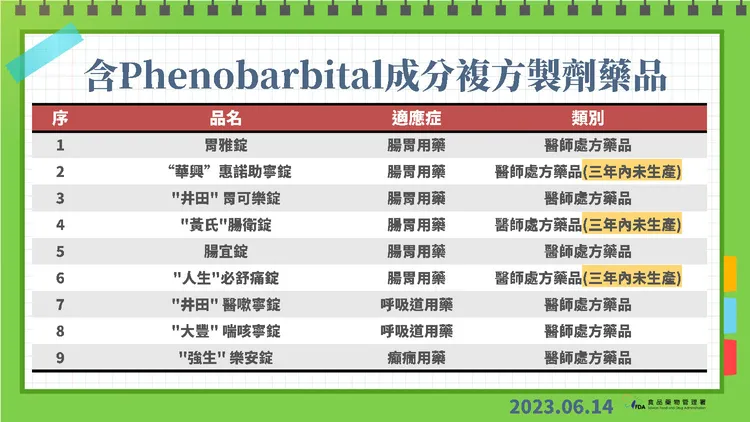 至於一般藥品目前尚未被切結不得製造或輸入者,陳惠芳表示,共計9張藥品許可證,主要為含Phenobarital成分的複方藥品,其中6張屬腸胃用藥、2張為呼吸道用藥、1張為癲癇用藥。