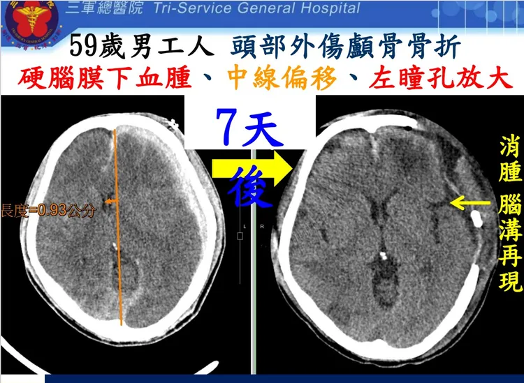 一位59歲男性日前於工地上班時自3米高處墜落,當場昏迷,送到三總急診時,檢查顯示有顱內出血、左邊肋骨骨折、兩邊氣胸、左側股骨髕骨粉碎性骨折等狀況,呈現創傷性腦出血合併一側瞳孔放大。神經外科團隊緊急進行開顱減壓手術,不過腦壓仍然很高。
