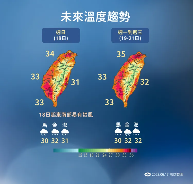 下週四、下週五午後甚至有機會擴及到西半部平地;溫度逐漸升高,高溫普遍來到33至35°C,局部溫度會再更高一些,且下週一至下週四東南部有焚風發生的機率。