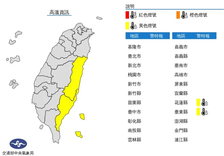 受到西南風影響,氣象局預報員林定宜表示,今日台東縣地區有焚風發生機率,中午前後花蓮縣地區、台東縣地區為黃色燈號,氣溫將達到36°C以上,影響時間到下午5時。