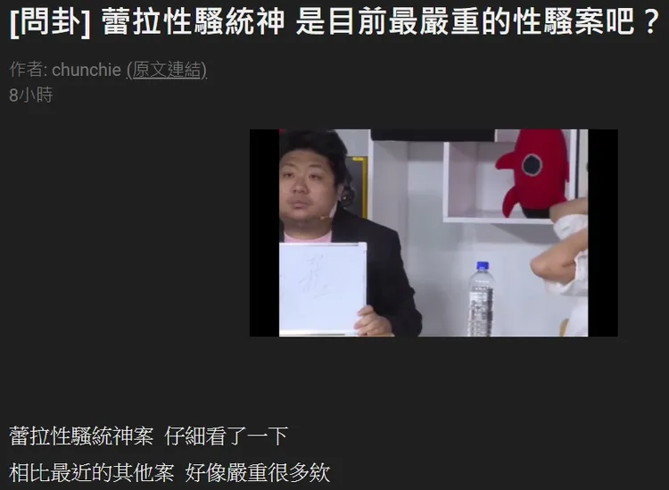 發文者稱,相比最近的其他案,仔細想想,蕾拉性騷統神案,好像是目前最嚴重的性騷案欸,引發鄉民熱議,「他自頭到尾都是表示抗拒與不舒服」、「沒錯,男生也會被性騷擾」、「張家航!成熟男人的進行式」、「證據確鑿的受害者沒人理,還被公然訕笑」、「統神臉臭到不行」、「最有證據性的me too」。