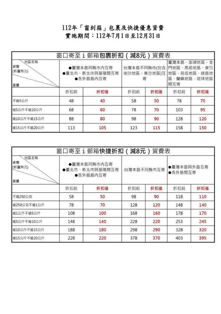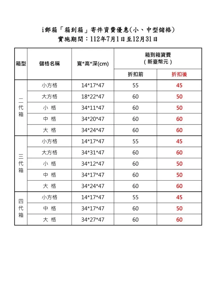 中華郵政公司說明,「i郵箱」郵資優惠方案,除國內包裹與快捷郵件便宜,另國內包裹自「i郵箱」寄件至「i郵箱」取件(箱到箱),小型、中型儲格優惠資費分別為45元及50元。