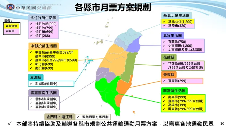 交通部表示,除了上述三大生活圈11個縣市即將推出月票,以及金門縣及連江縣暫無月票規劃外,全國目前還有9個縣市刻正規劃月票方案中,包含北宜、桃竹竹苗、雲嘉嘉南3個生活圈,以及3個單一縣市,如花蓮縣、台東縣、澎湖縣,後續公路總局也會進行輔導及協助,希望在今年下半年其它生活圈或縣市的月票可以陸續上路。