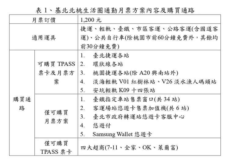 基北北桃生活圈月票定價1,200元,適用運具為生活圈境內捷運、輕軌、台鐵、市區客運、公路客運(含國道客運)及公共自行車(除桃園市前60分鐘免費外,其餘均前30分鐘免費),較原本雙北推出的1280月票價格更優惠,可搭乘的運具更多。