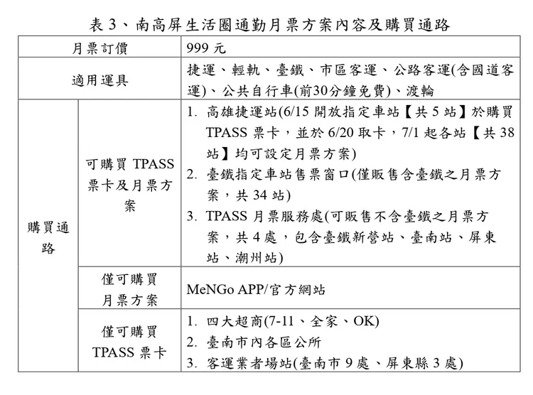 南高屏生活圈月票定價為999元,適用運具為生活圈境內捷運、台鐵、市區客運、公路客運、公共自行車(前30分鐘免費)及渡輪(鼓山-旗津、前鎮-中洲)。另外台南市都市內通勤月票(含台鐵399元)、高雄市都市內通勤月票(含399元)及屏東縣都市內通勤月票(含台鐵399元),亦將於7月1日起同步上路實施。