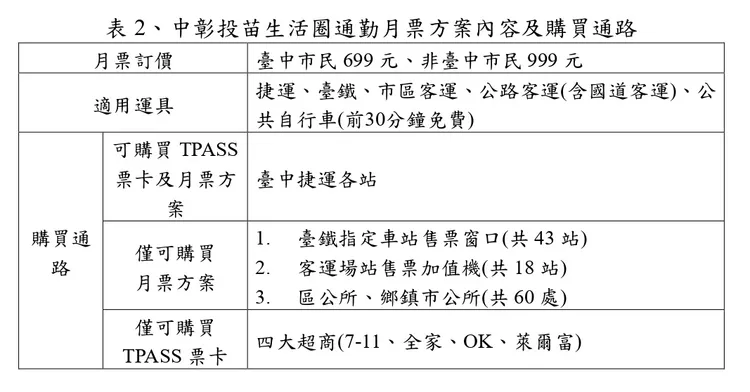 中彰投苗生活圈月票定價為台中市民699元、非台中市民999元,適用運具為生活圈境內捷運、台鐵、市區客運、公路客運(含國道客運)及公共自行車(前30分鐘免費)。