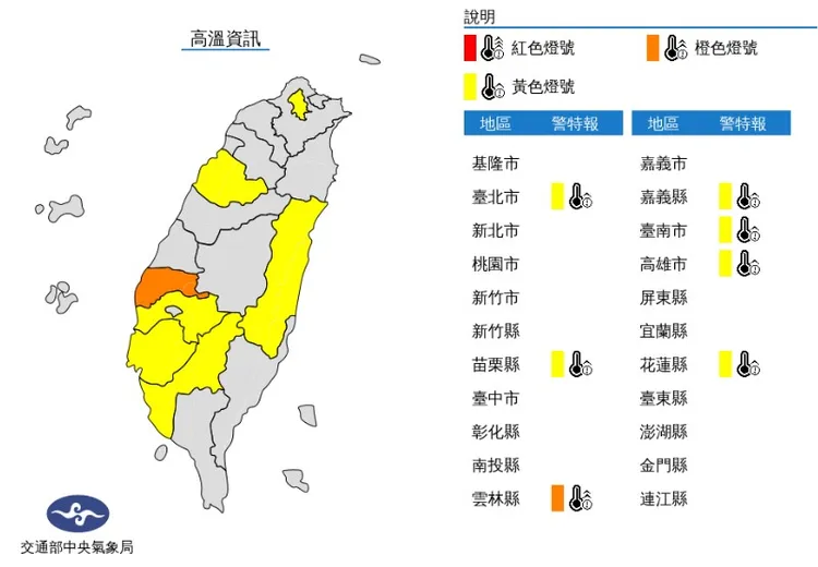 氣象局明日白天針對7縣市發布高溫警戒,尤其中午前後雲林縣為橙色燈號,有連續出現36°C高溫機率。台北市、苗栗縣、嘉義縣、台南市、高雄市、花蓮縣為黃色燈號,有36°C以上高溫機率。