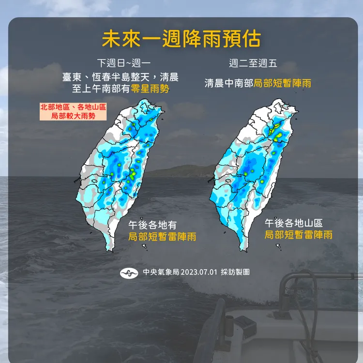 明日和下周一(7/3)天氣差不多,但是下周二(7/4)之後會變成偏西南風,午後熱對流發展比較侷限在山區,平地的降雨機率就會低一點,在西南風情況下,高溫比較容易集中在雙北盆地、花東縱谷。下周二至下周六(7/8)台東有焚風發生機率。