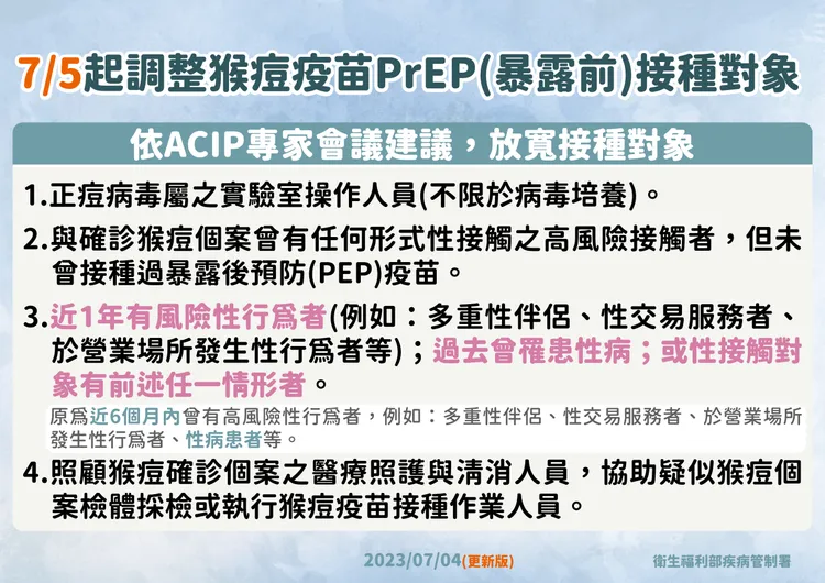 衛福部傳染病防治諮詢會預防接種組(ACIP)日前會議討論放寬猴痘疫苗接種對象,並於會中建議,「近1年有風險性行為者(例如:多重性伴侶、性交易服務者、於營業場所發生性行為者等);過去曾罹患性病;或性接觸對象有前述任一情形者」,均可接種疫苗,今疾管署正式公佈自7月5日起擴大猴痘疫苗接種對象,呼籲符合猴痘疫苗接種條件民眾儘速接種疫苗。
