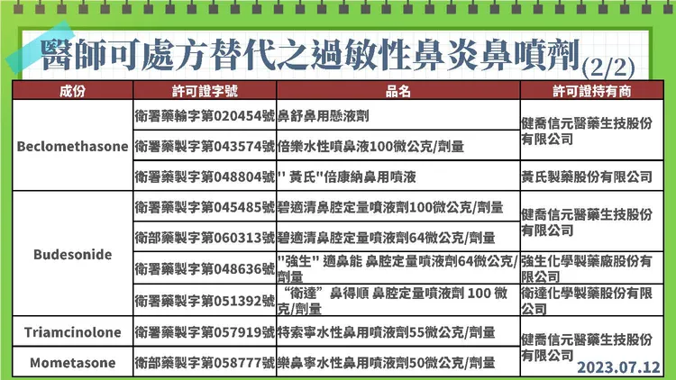 陳惠芳指出,目前國內已核准多種其他類固醇成分且用於過敏性鼻炎之鼻噴劑,臨床顯示各種類固醇成分的鼻噴劑都有相當的治療效力,可供醫師處方替代使用,如Budesonide、Beclomethasone、Triamcinolone、 Mometasone等,且前述藥品國內合計有9張學名藥許可證,目前正常供應中。