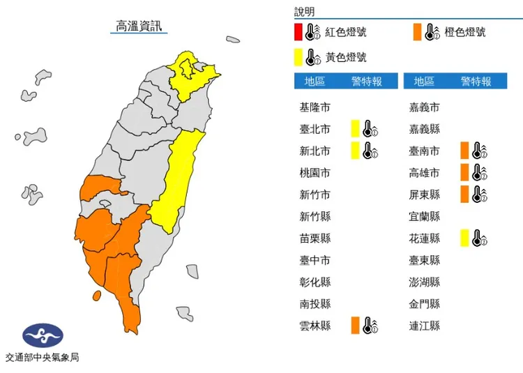 氣象局明日白天針對7縣市發布高溫警戒,中午前後雲林縣、台南市、高雄市、屏東縣為橙色燈號,有連續出現36°C高溫的機率。台北市、新北市、花蓮縣為黃色燈號。
