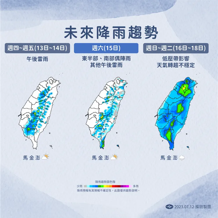 下周日至下周三(7/16至7/19)低壓帶影響,水氣持續增多;下周日東半部、南部、基隆北海岸及各地山區有短暫陣雨,其他地區為多雲,午後有局部短暫雷陣雨。