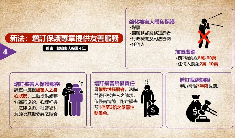 第四,「增訂保護專章提供友善服務」,張秀淵表示,為了避免被害人隱私暴露,範訂媒體及因職務或業務知悉者,應予保密,違者加重處罰6萬至60萬元,但成年受害人同意揭露或法院、檢察官在司法程序中認為有必要揭露可不罰。此外,任何人,亦應遵守保密義務,違者處2萬至10萬元罰鍰。