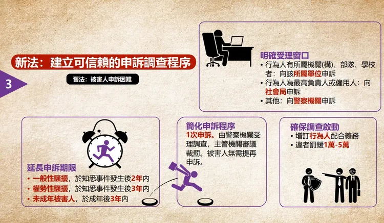 規範權勢性騷擾,於知悉事件發生3年內,可提起申訴;未成年被害人則可於成年後3年內提出申訴;至於一般性騷擾亦延長至2年內可提出申訴。且在整個調查過程中,行為人有配合調查之義務,違者處新臺幣1萬元至5萬元罰鍰。