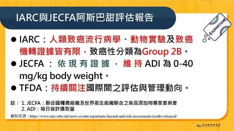 基於IARC說明需要更多證據去佐證阿斯巴甜的致癌性,JECFA也並未改變ADI,食藥署副署長林金富表示,後續將持續關注IARC與JECFA報告,及國際間對於阿斯巴甜安全性之評估與管理動向。