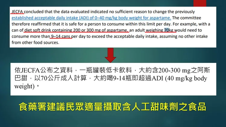 根據JECFA公布,一瓶罐裝低卡飲料,大約含200-300毫克mg阿斯巴甜,以70公斤成人計算,約喝9-14瓶就超過每日容許攝取量(40mg/kg body)。