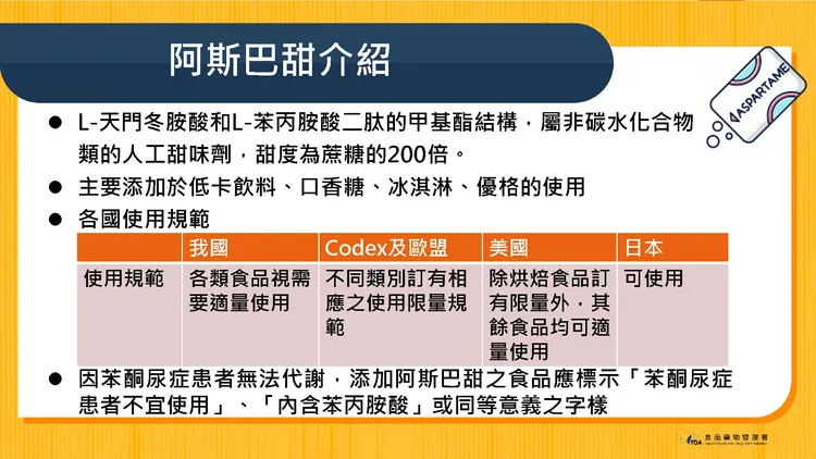 林口長庚臨床毒物中心主任顏宗海表示,阿斯巴甜(Aspartame)在美國、歐盟及台灣都是合法人工甜味劑,無熱量但甜度是蔗糖的200倍,使用一點點就能達到甜度,糖尿病人也合適,所以廣泛用於口香糖、冰淇淋、飲料。
