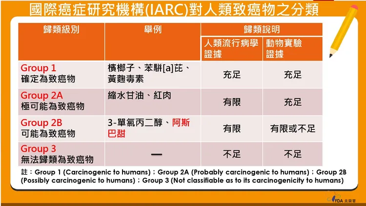 世衛組織旗下「國際癌症研究中心」(IARC)今日(7/14)將阿斯巴甜列為2B人類可能致癌物,代表部分動物實驗證實會增加癌症風險,例如肝癌,但在人體上沒有致癌證據。