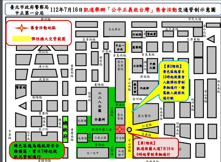 凱達格蘭大道【中山南路至公園路】,於7月16日(星期日)0時起管制全線車道,禁止車輛通行。(視交通狀況提早或延後管制)